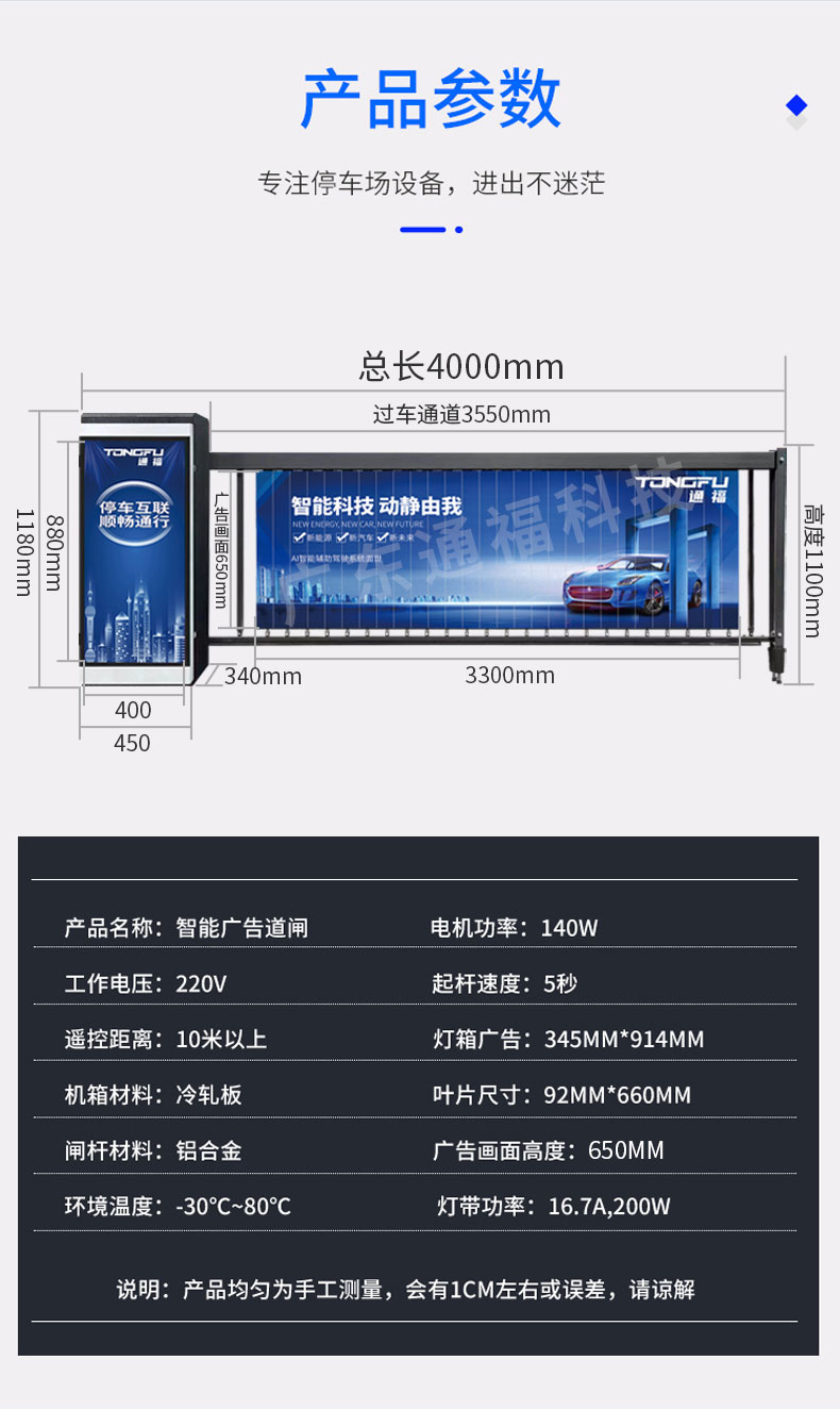 8、道闸设计美观,适合小区,商业旺地、公共场所、商务大厦、港口、商务停车场等地。广告道闸,作为传统道闸与现代广告机的结合体,未来必定会成为停车场产品的新宠;