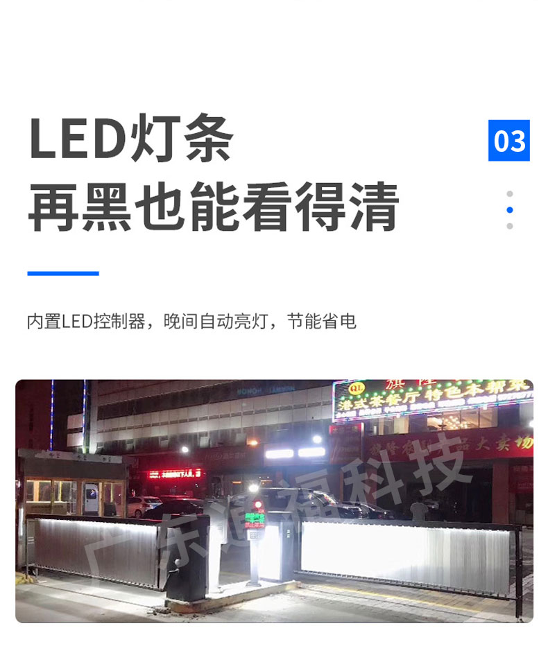 3、支撑杆采用稳定缓冲脚设计,落杆平缓、声音轻,减少落杆惯性,保护机芯产;具有开关、延时落闸功能,安装空气压力波感应器,关闸时避免砸车、砸人;多重保护措施(防风保护、电机热保护、抗电涌保护等),极大提高道闸运行的安全性和可靠性;