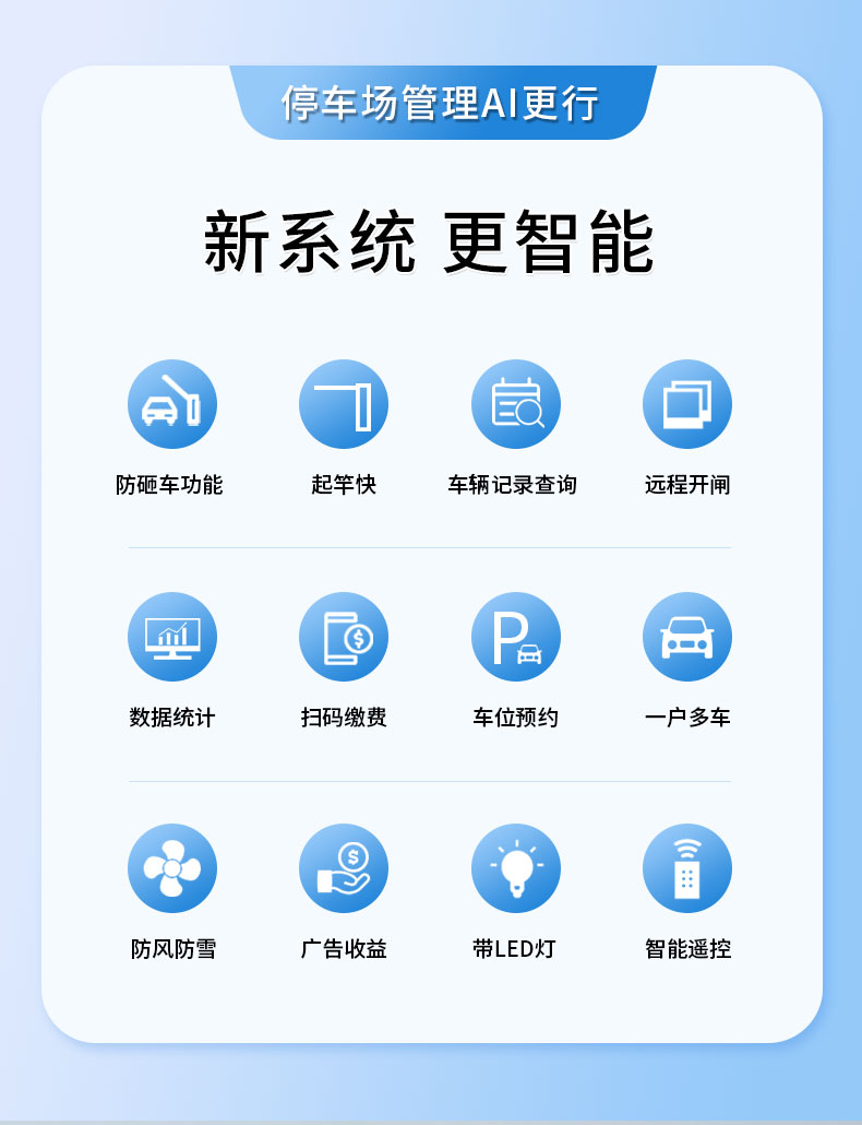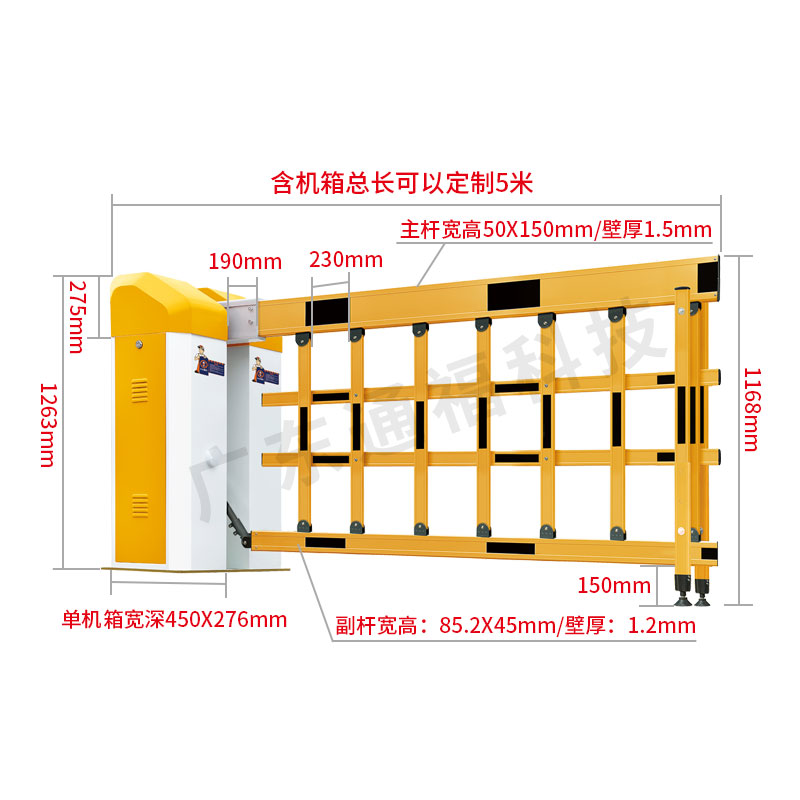 采用加强四连杆传动结构和250W大功率双级减速电机,传动效率高,运动平稳。此外,多根弹簧平衡拉力设计使得闸杆起落更加平稳,延长弹簧寿命。