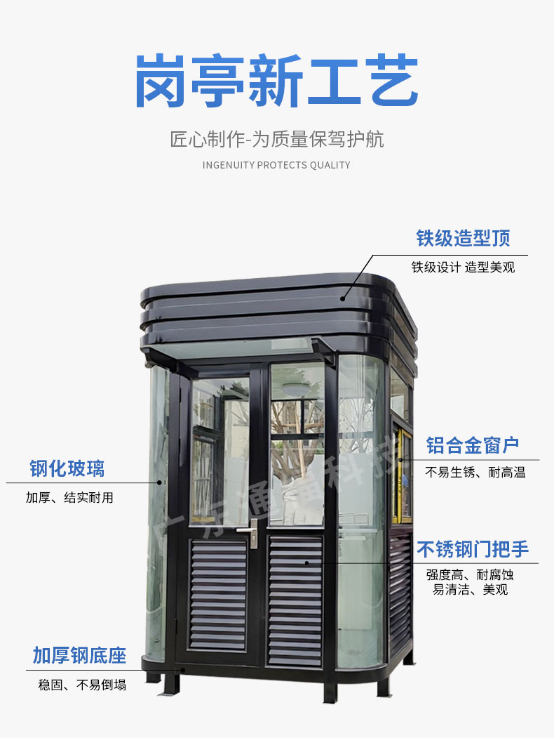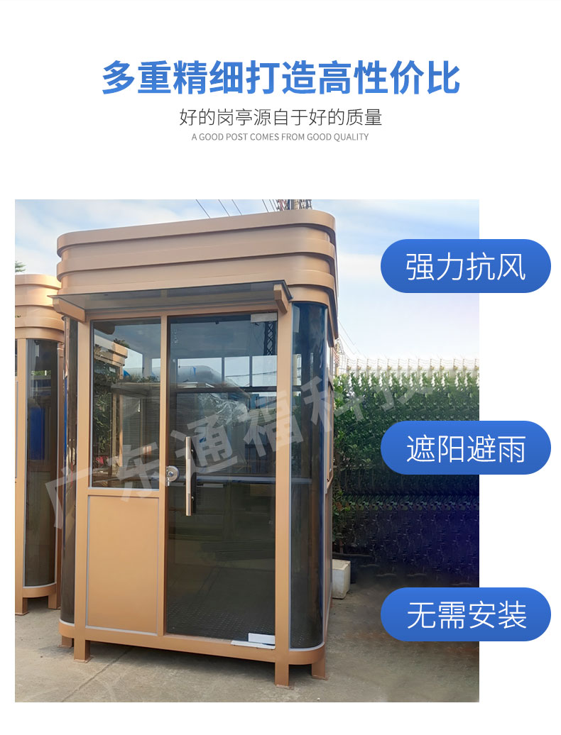 作为保安岗亭,肯定是放到室外的,大家一般都选用钢化夹胶玻璃,随后贴上两层的太阳膜,在夏季的曝晒中呆在凉亭内部也不会觉得酷热,并且重外边看不见里边,可是能够重里边监控到外边,能够给保安岗亭工作人员产生非常大的便捷。