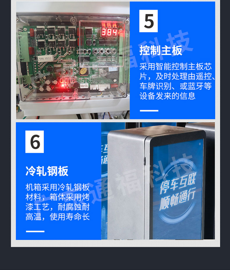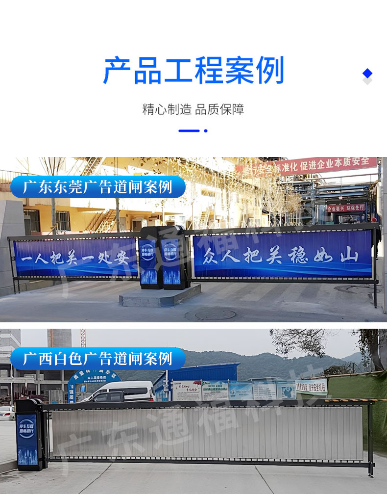 3、支撑杆采用稳定缓冲脚设计,落杆平缓、声音轻,减少落杆惯性,保护机芯产;具有开关、延时落闸功能,安装空气压力波感应器,关闸时避免砸车、砸人;多重保护措施(防风保护、电机热保护、抗电涌保护等),极大提高道闸运行的安全性和可靠性;