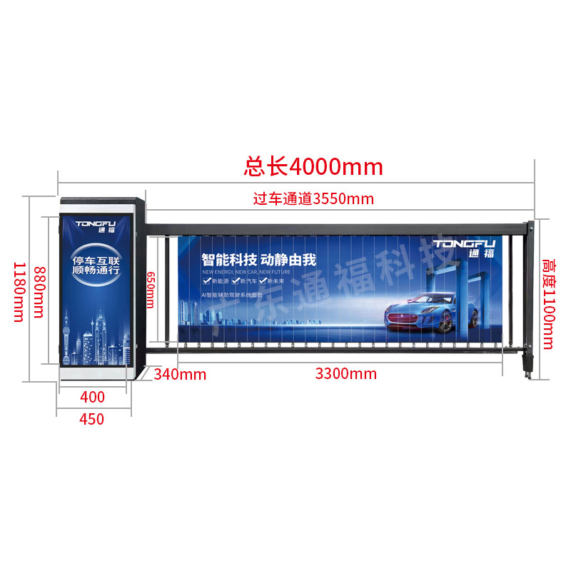 1、广告道闸杆采用专利无动力驱动,结构稳定、故障率低;