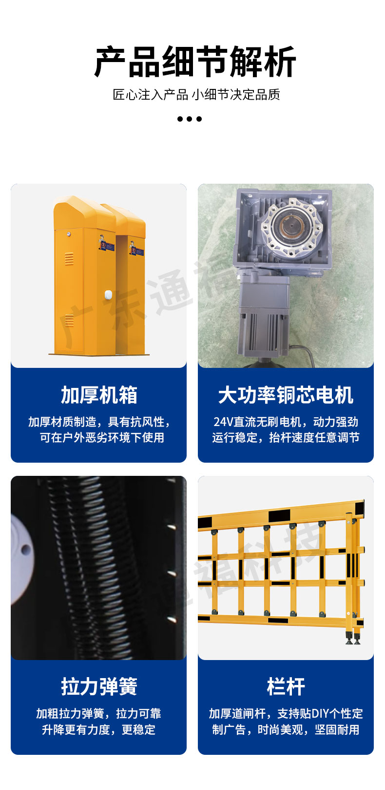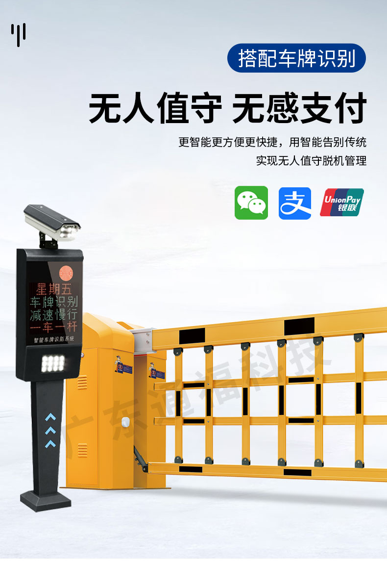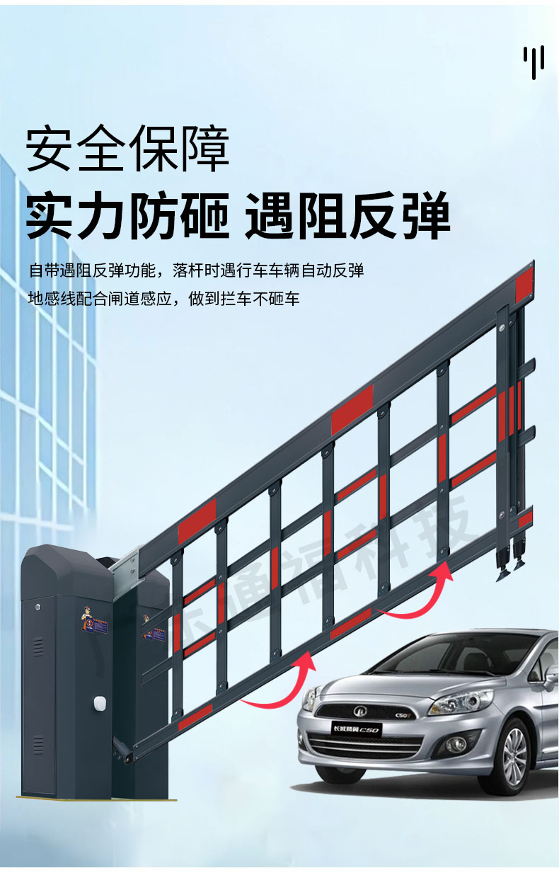 采用加强四连杆传动结构和250W大功率双级减速电机,传动效率高,运动平稳。此外,多根弹簧平衡拉力设计使得闸杆起落更加平稳,延长弹簧寿命。